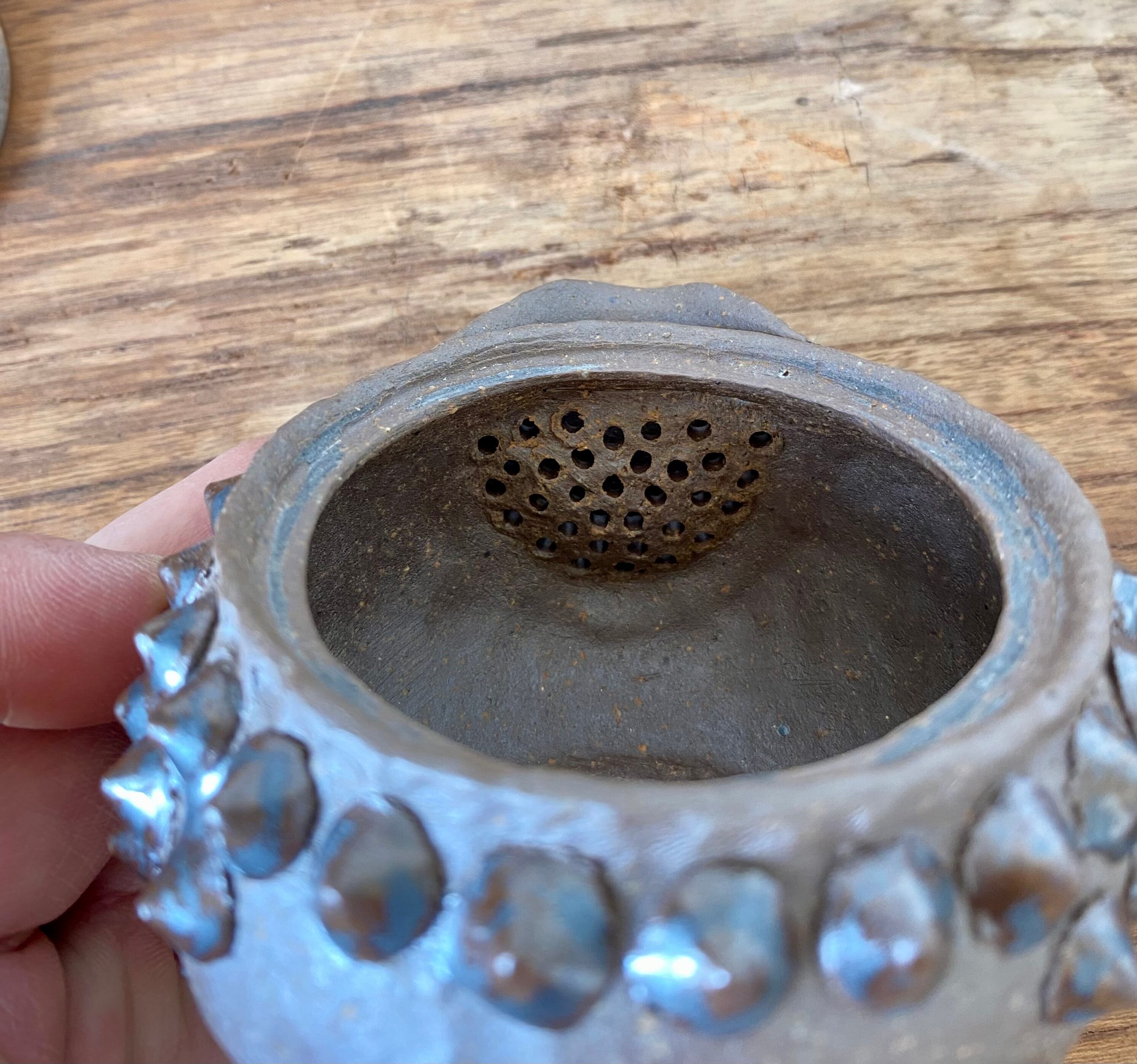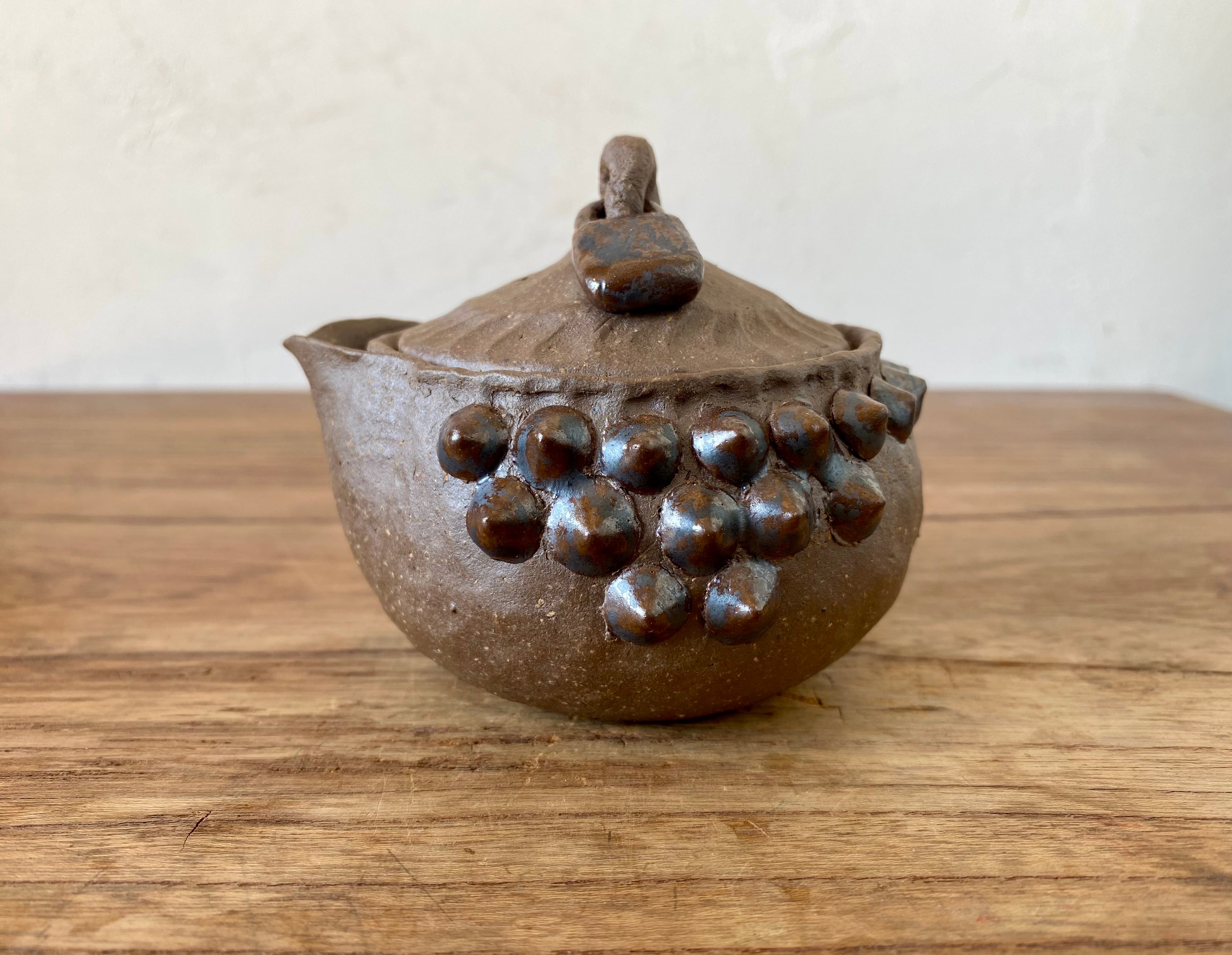土の団子から手捻りで捻り出した宝瓶です。外観はロックな鋲のデザインで、特別感を演出しています。蓋の南京錠は、お茶を入れた時にゆらゆら動く様子が楽しめます。見た目は大胆ですが、使用すると持ちやすく、優れた安定感を提供します。