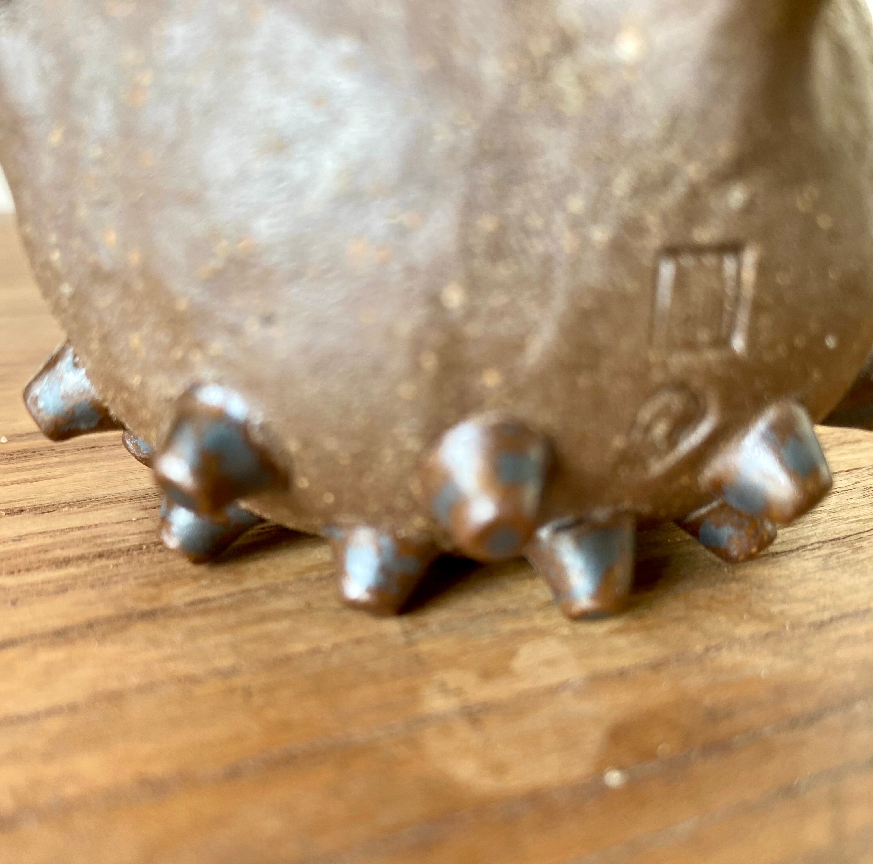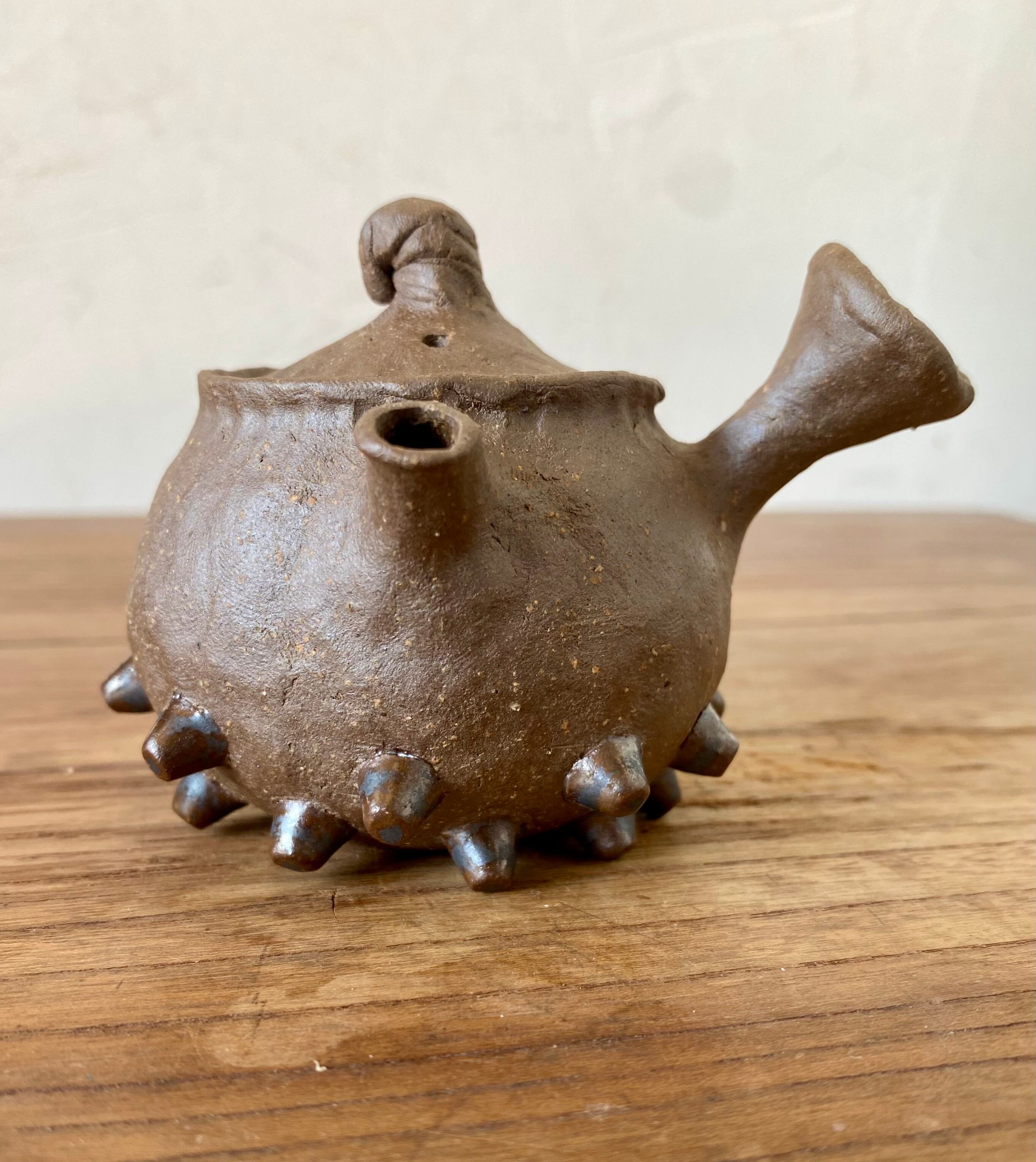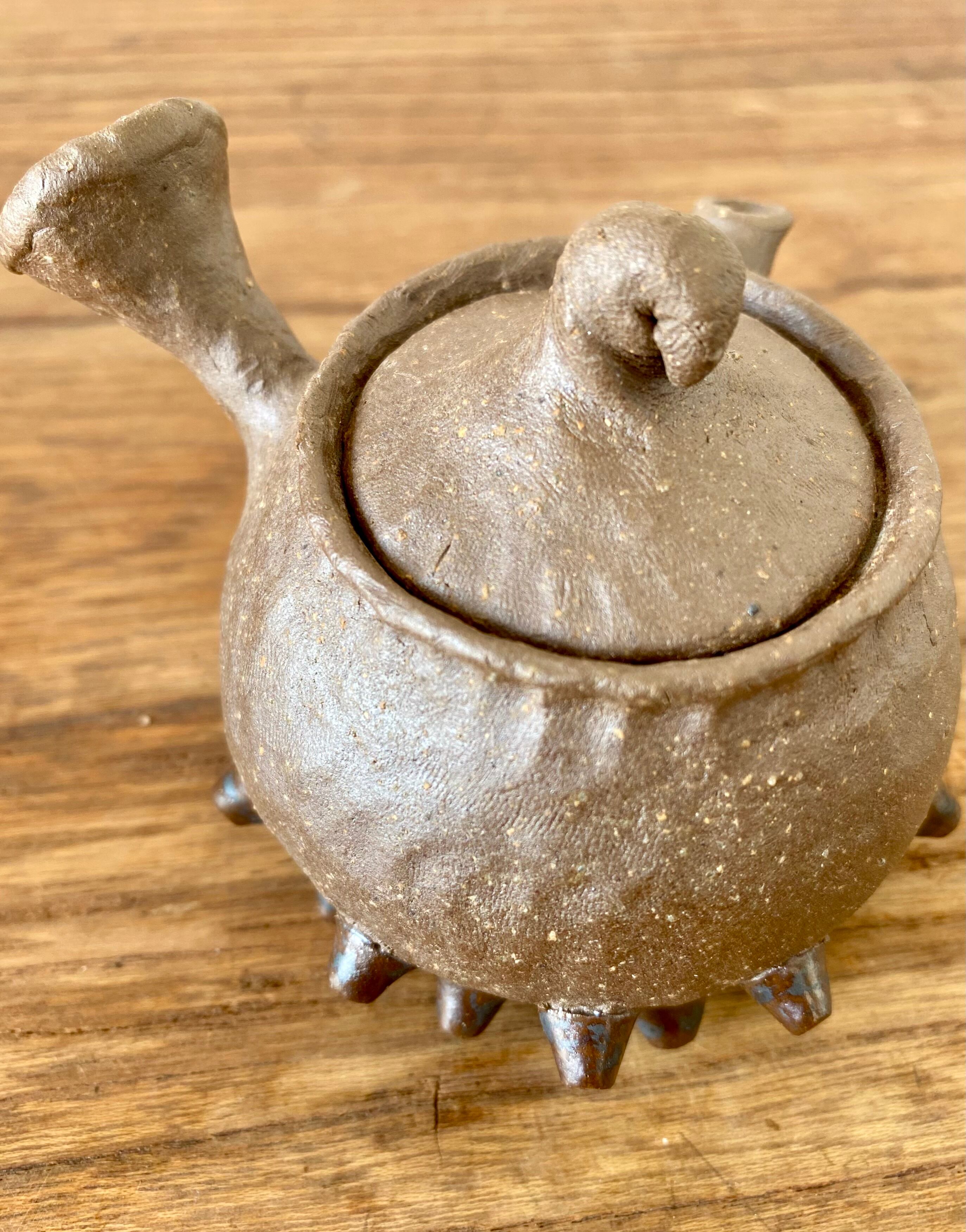 土の団子を指で捻り出して作り上げた手捻り急須です。独特の形状ながら、持ちやすさと安定感を考慮した設計が魅力です。ロックなフォルムは、日常のティータイムに特別な雰囲気をもたらします。