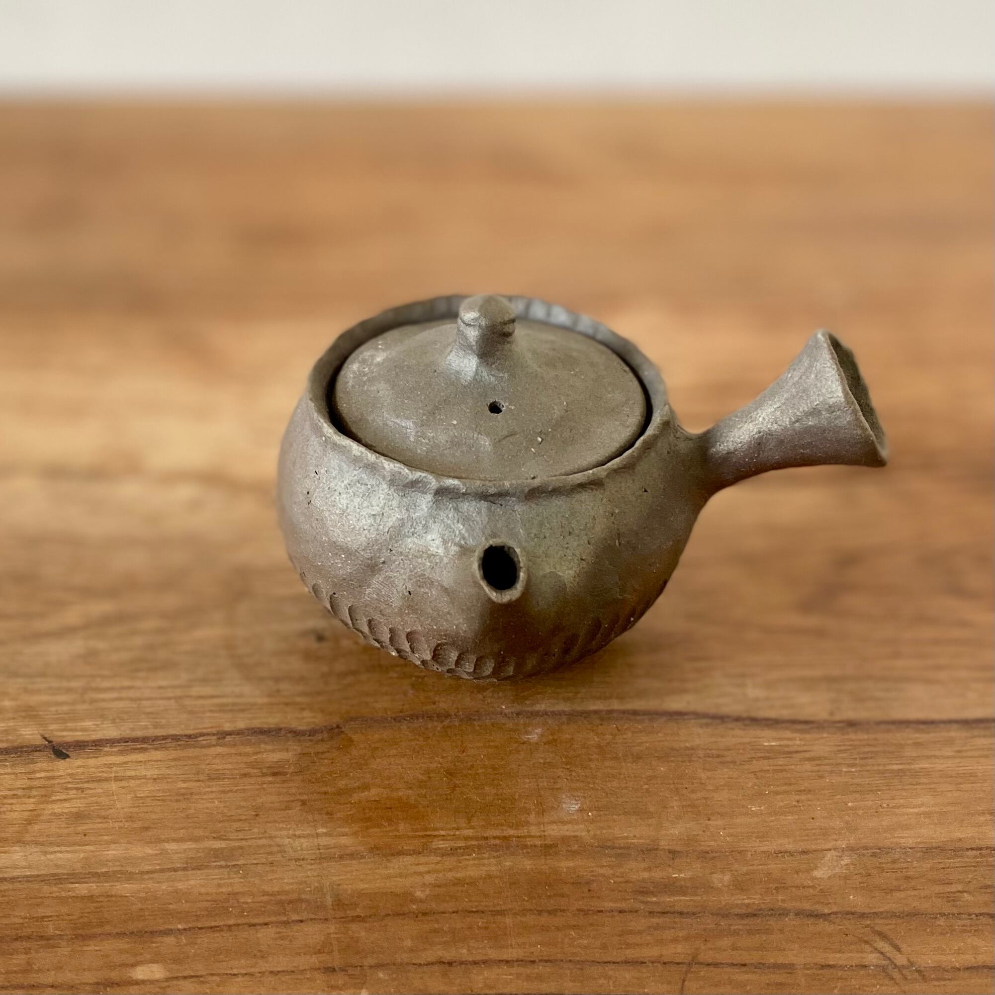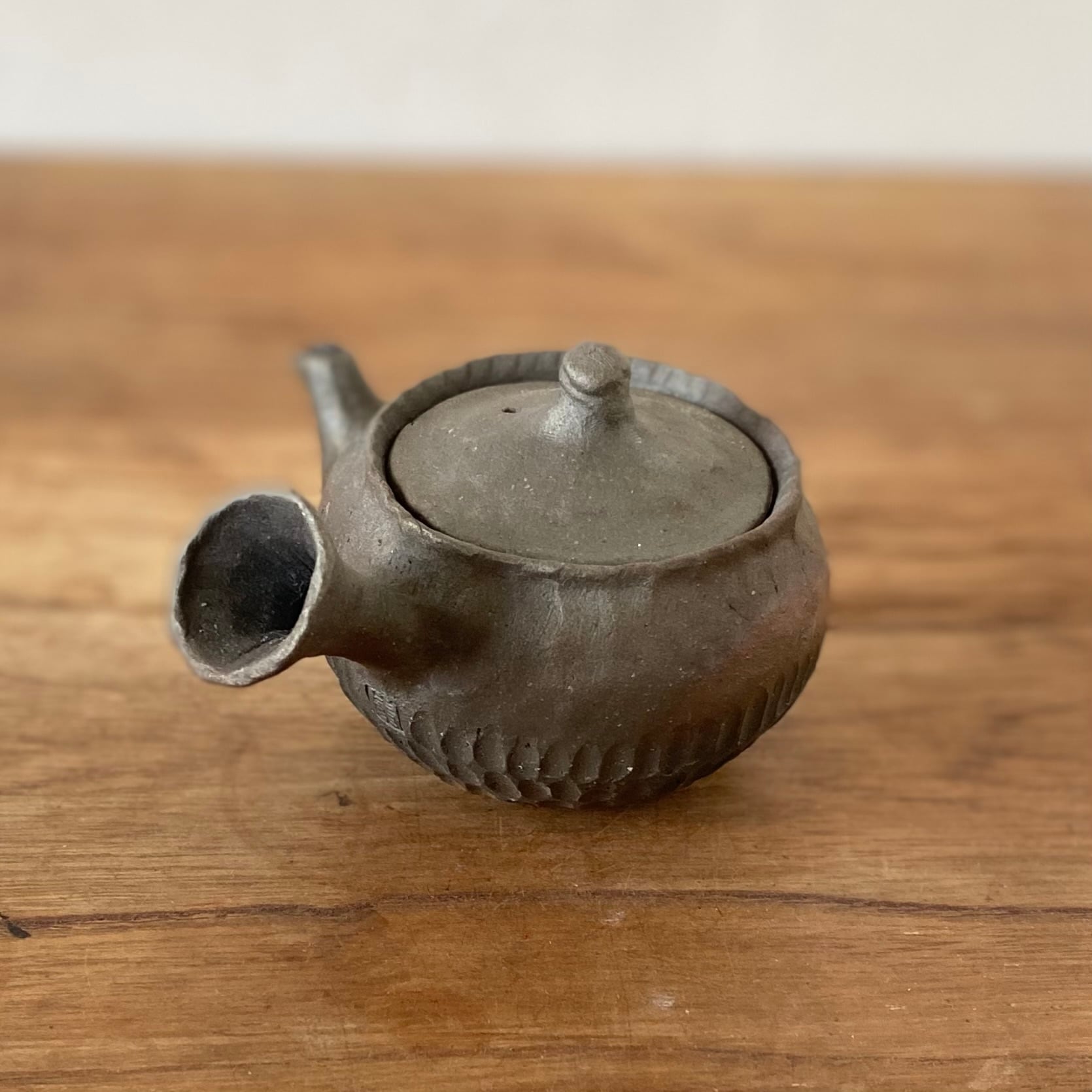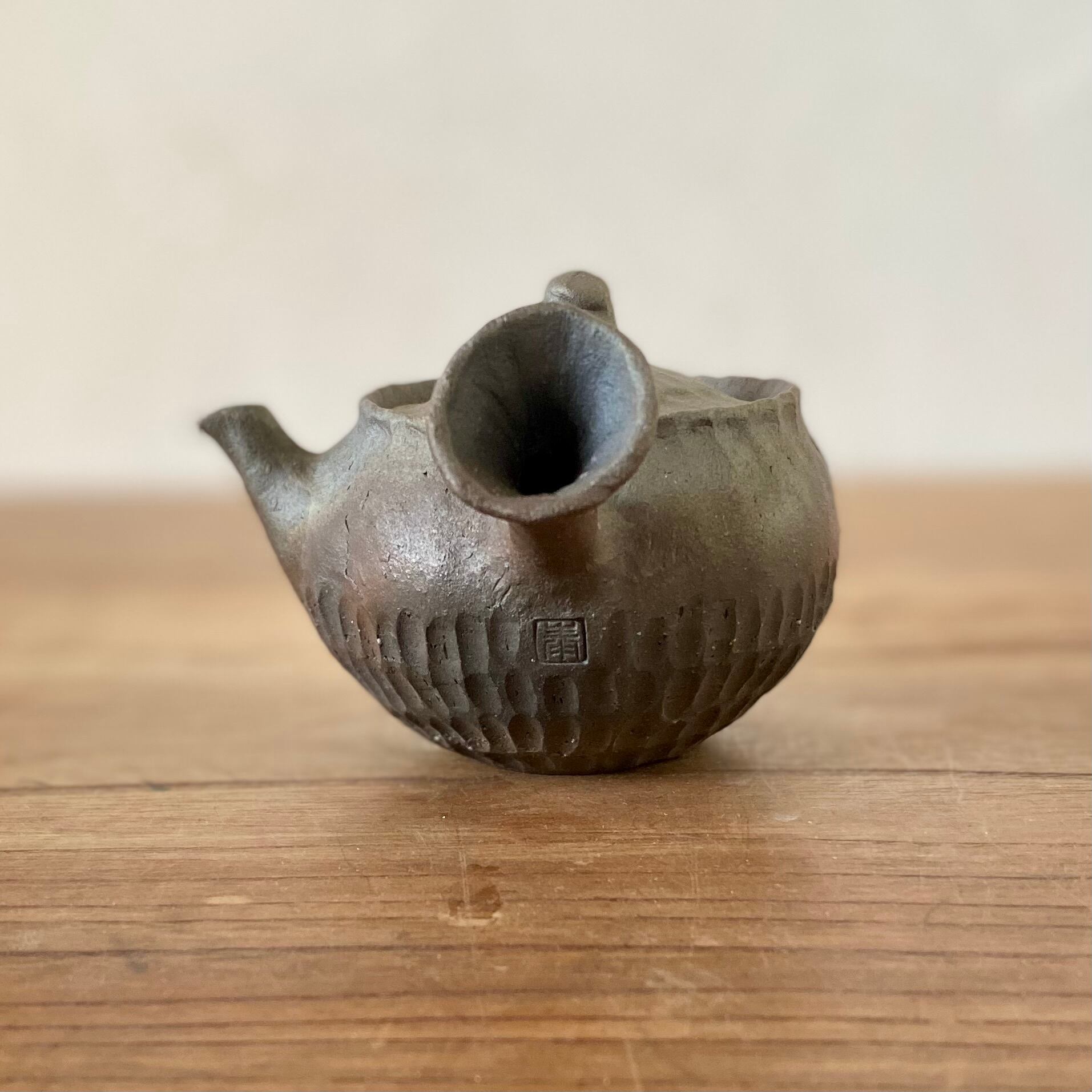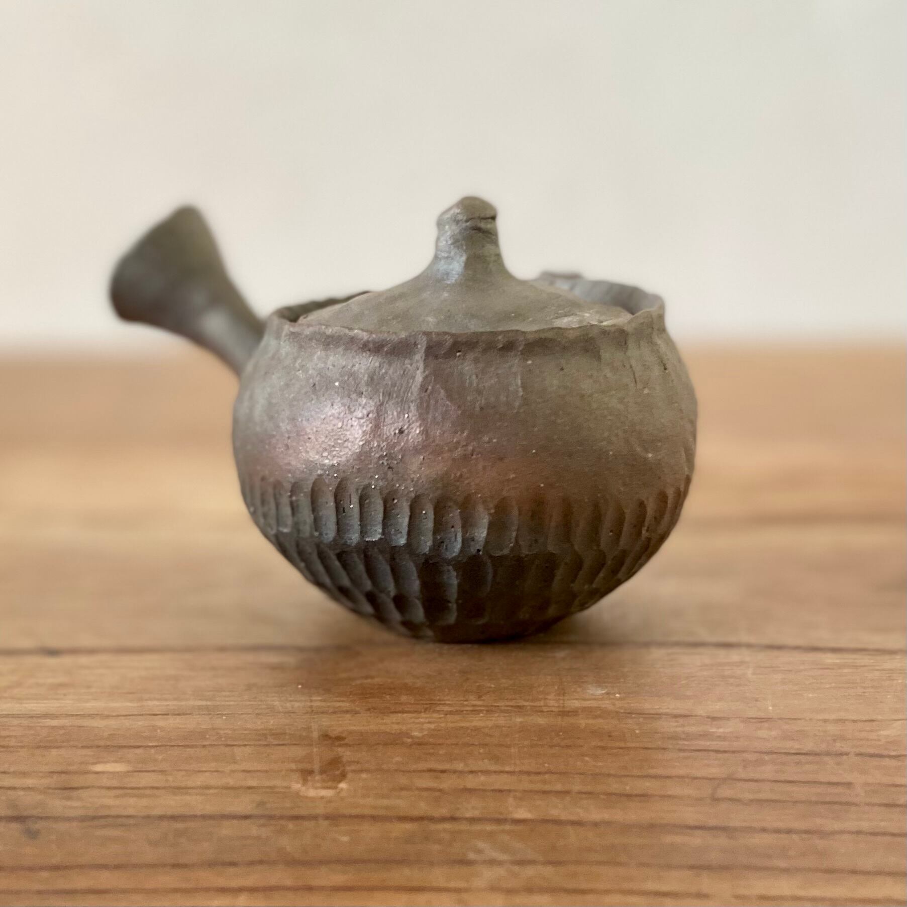 サヤの中に籾殻や炭を入れて焼成した、モクモク燻し手捻り急須です。独特な形状と、やさしい温かみを感じる手捻りの風合いが魅力です。手作りのぬくもりが感じられ、見るたびに心を和ませます。