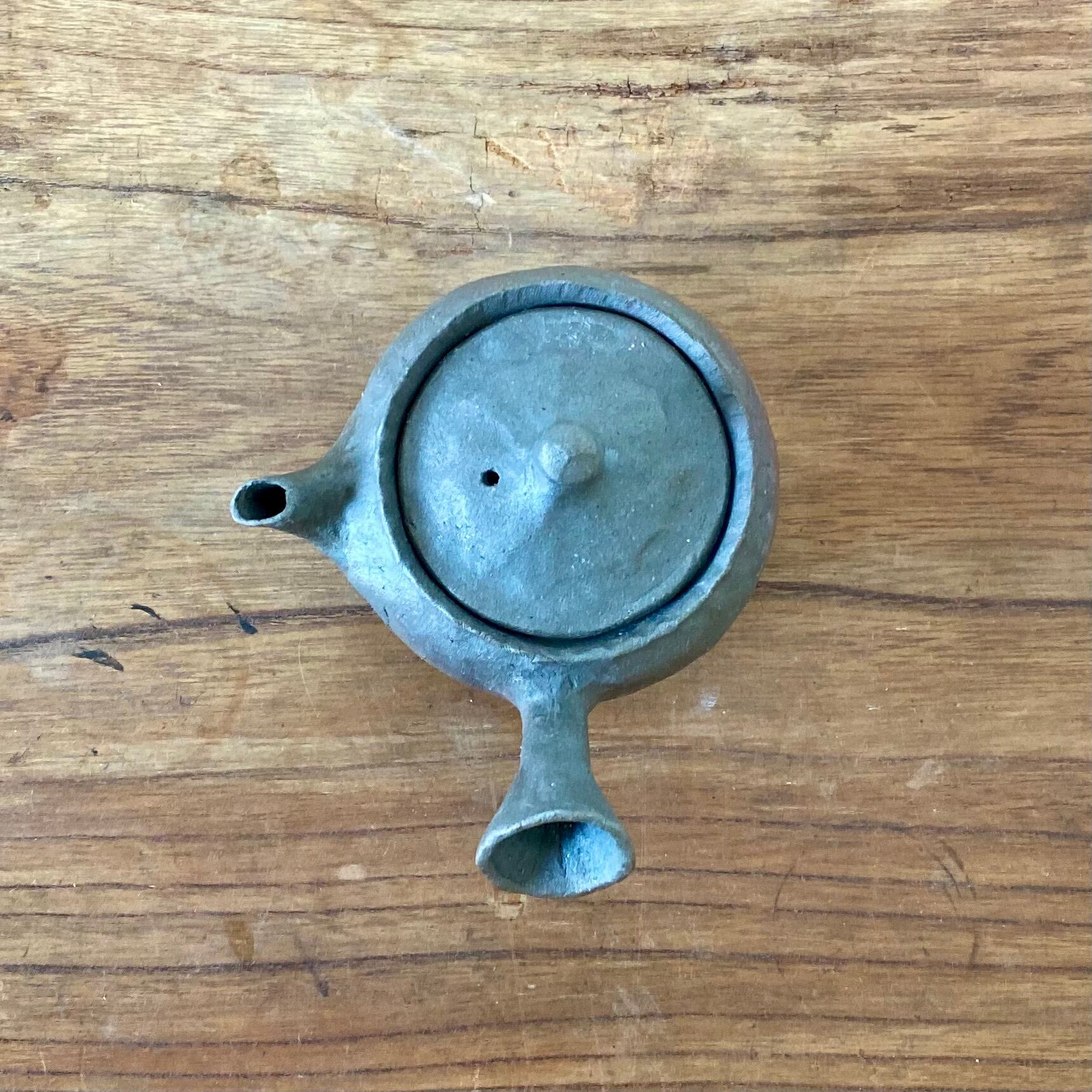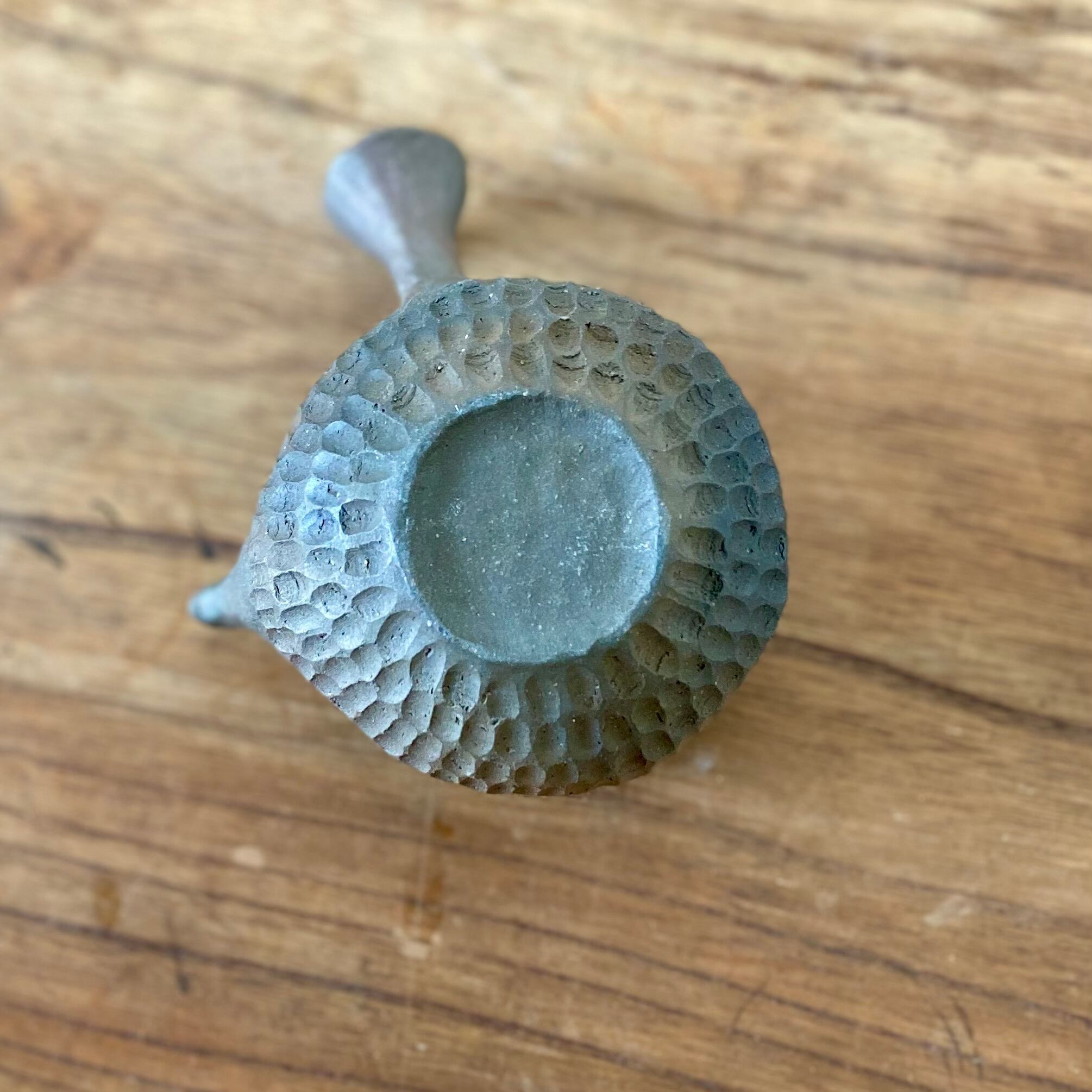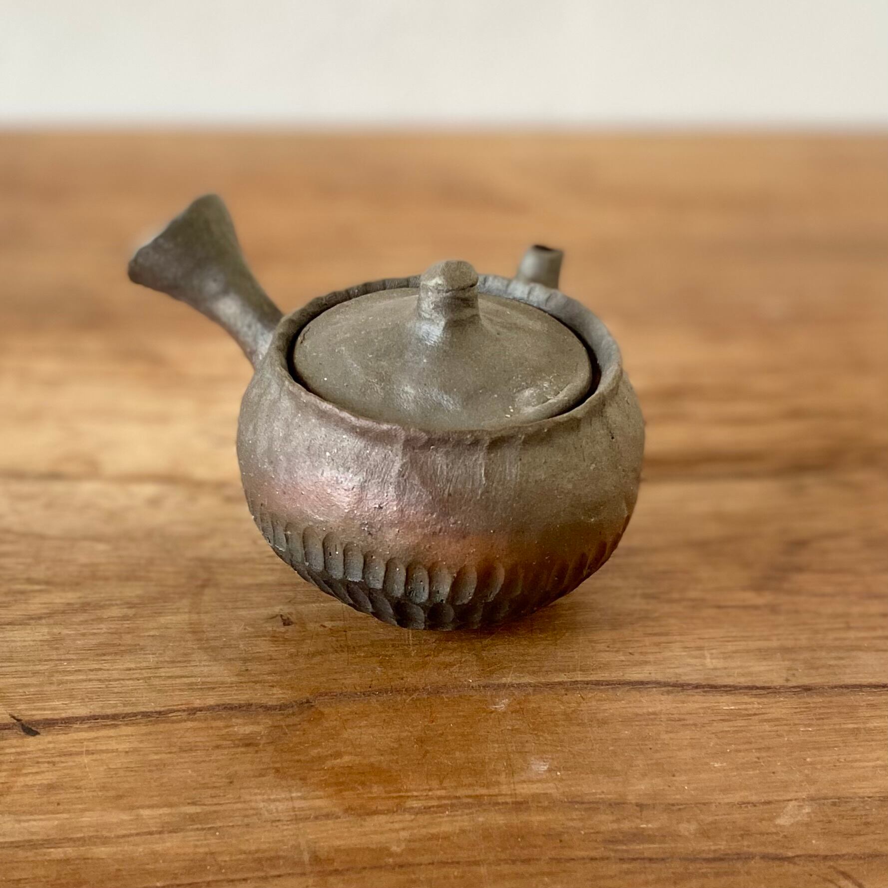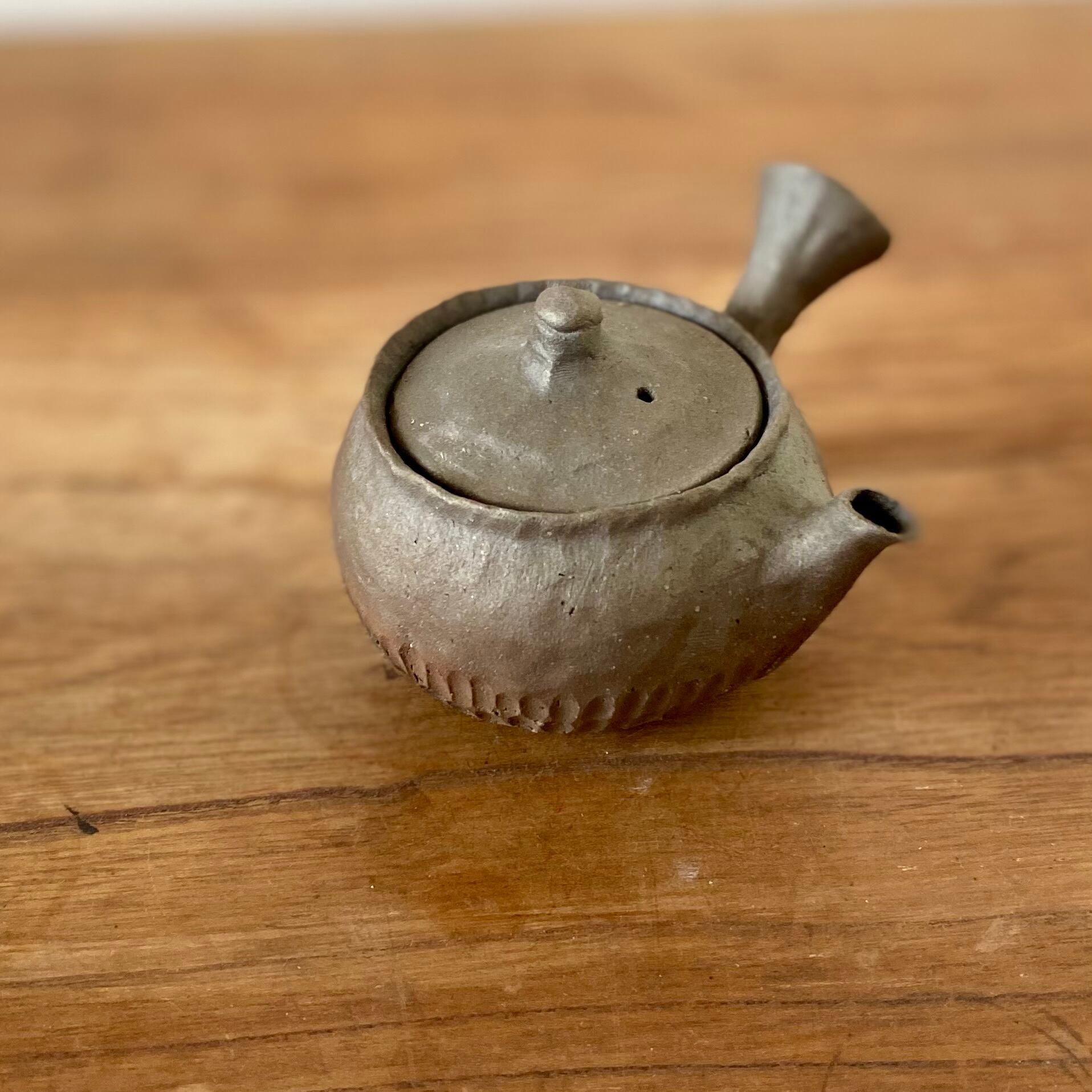 サヤの中に籾殻や炭を入れて焼成した、モクモク燻し手捻り急須です。独特な形状と、やさしい温かみを感じる手捻りの風合いが魅力です。手作りのぬくもりが感じられ、見るたびに心を和ませます。